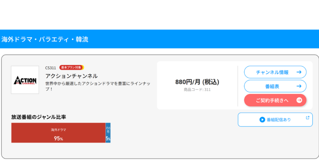 アクションチャンネルはスカパーで契約して視聴できる“ジャンル特化型”の専門チャンネルです。